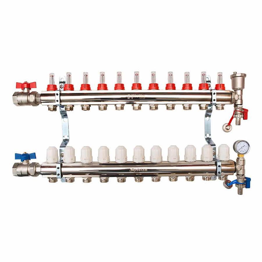 Hetta 11 Port Underfloor Heating Manifold, Nickel-plated pre-assembled distribution manifold complete with – Isolating ball valves, adjustable flow meters, fill and drain points, automatic air vents.